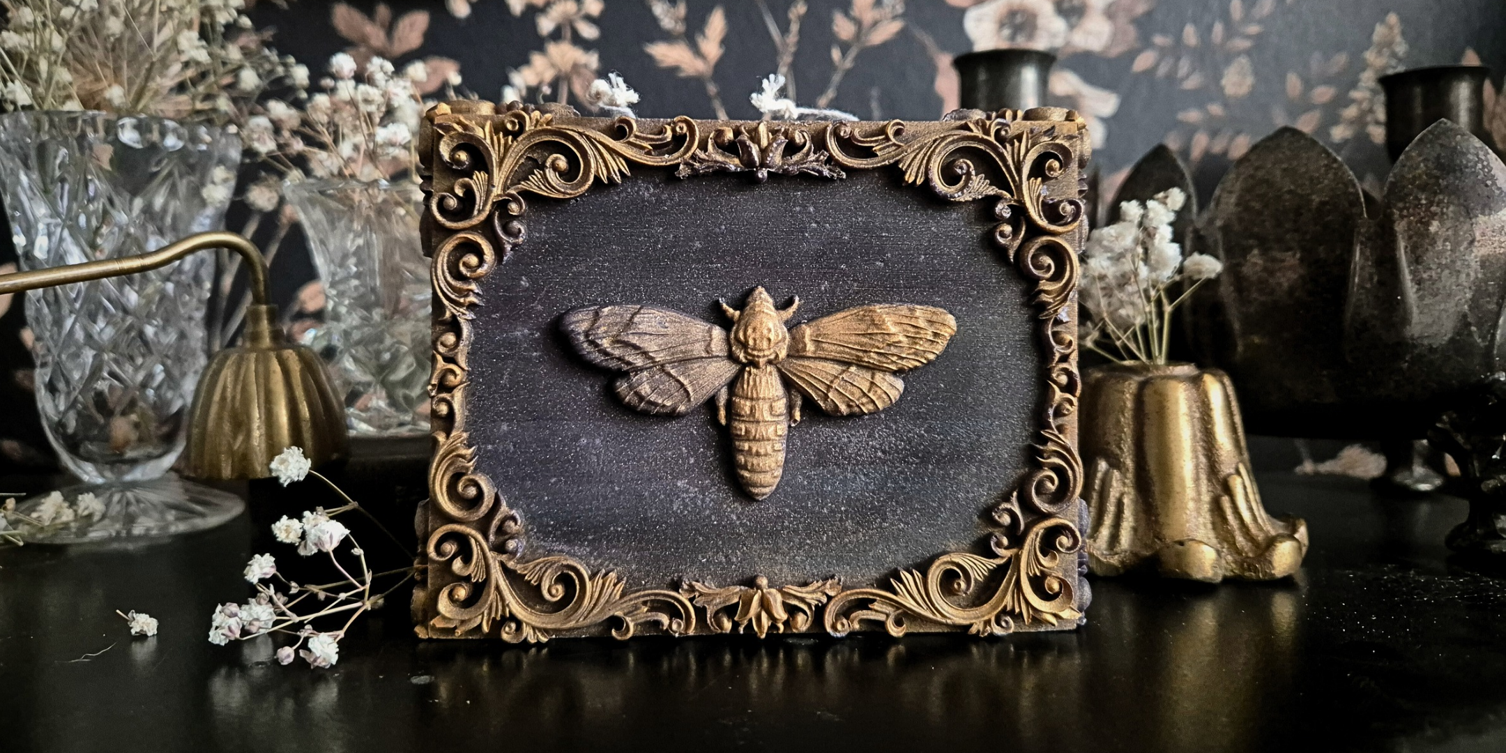 This gorgeous piece has been hand crafted to capture the beauty of life and death. Moth To A Flame celebrates preserving beauty and the art of entomology. This candle will add a sense of dark elegance and timeless beauty to your home.